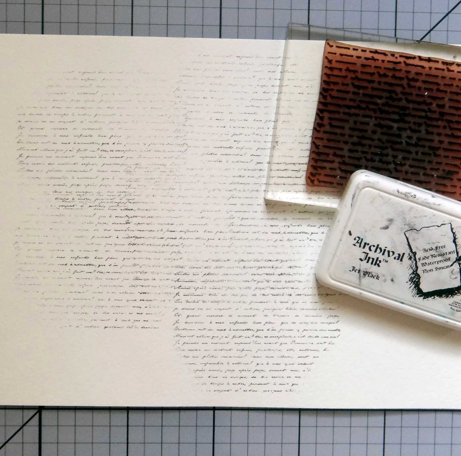 1. Let's start with creating a background by placing rubber stamps with some text onto cardstock.